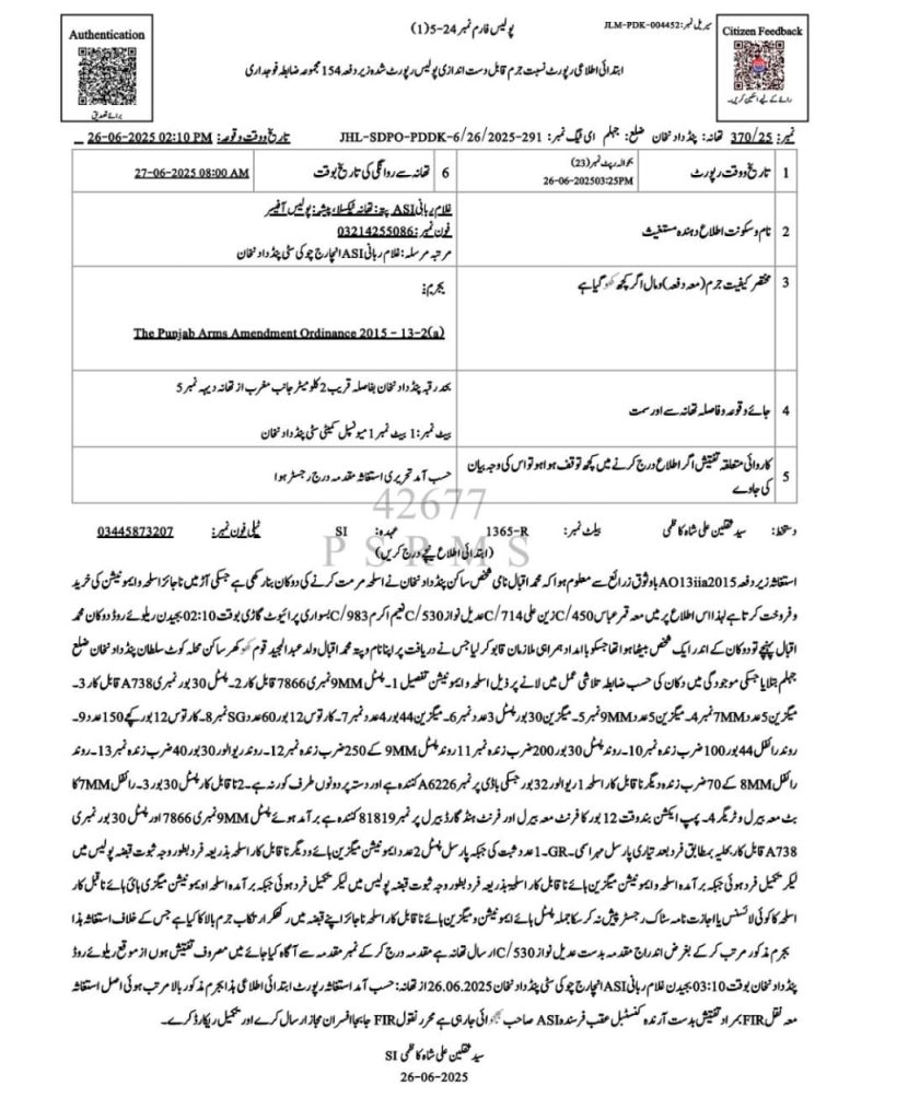 ایس ایچ او تھانہ پنڈ دادنخان کی زیرِ قیادت انچارج چوکی سٹی پنڈ دادنخان ملک غلام ربانی اور ٹیم کی اہم کاروائی،بغیر لائسنس کے ناجائز اسلحہ فروخت کرنے والا ملزم گرفتار، بھاری مقدار میں ناجائز اسلحہ برآمد