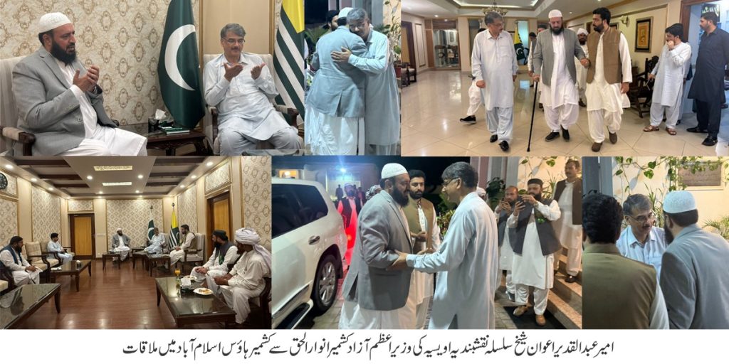 امیر عبدالقدیر اعوان شیخ سلسلہ نقشبندیہ اویسیہ کی وزیراعظم آزاد کشمیر انوار الحق سے کشمیر ہاؤس اسلام آباد میں ملاقات حضرت امیر عبدالقدیر اعوان شیخ سلسلہ کو انوار الحق صاحب نے پرتپاک استقبال کرتے ہوئے خوش آمدید کہا۔ملاقات ایک گھنٹہ سے زیادہ رہی۔جس میں مختلف امور پر تبادلہ خیال کیا گیا۔ملک میں موجودہ سیلابی صورت حال پر بھی بات ہوئی۔اس موقع پر حضرت نے وزیر اعظم آزاد کشمیر کو مولانا امیر محمد اکرم اعوان ؒ کا لکھا انتہائی آسان فہم قرآن کریم کا ترجمہ اکرم التراجم اور حضرت ؒ کی لکھی قرآن کریم کی تفسیر، اکرم التفاسیر بھی پیش کی۔حضرت امیر عبدالقدیر اعوان کے ساتھ وفد میں نعیم بشیر بھاگٹ،امجد اعوان سیکرٹری اطلاعات تنظیم الاخوان پاکستان اور محمد مصطفے انچارج رضاکاران آل پاکستان بھی شامل تھے۔