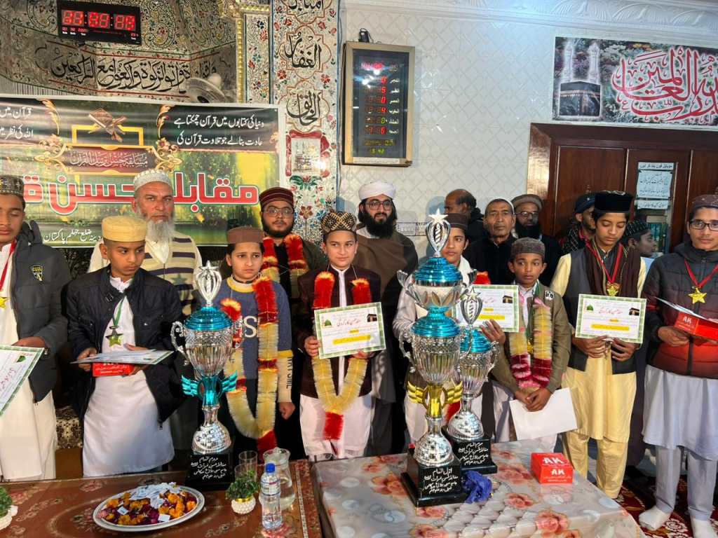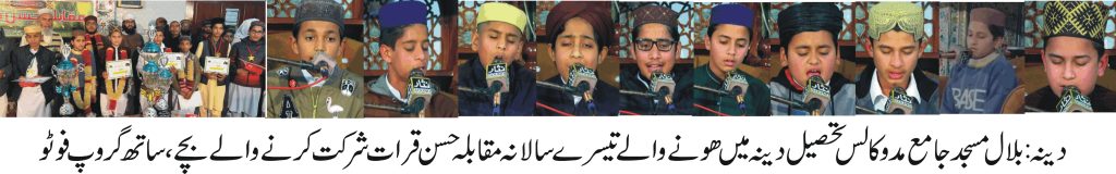 دینہ:بلال مسجد جامع مدوکالس تحصیل دینہ میں ھونے والے تیسرا سالانہ مقابلہ حسن قرات محمد حسان آف مدوکالس نے پہلی پوزیشن حاصل کر کے 20 ہزار روپے نقد اور ٹرافی انعام میں جیت لی. عبیداللہ نے دوسری اورجواد ندیم نے تیسری پوزیشن حاصل کی ۔عالمی شہرت یافتہ قاری ذیشان حنیف قادری کی لاہور سے آمد ۔ اپنی تلاوت سے خوب داد وصول کی ۔