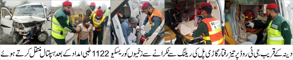 دینہ (رضوان سیٹھی سے) دینہ کے قریب جی ٹی روڈ پر تیز رفتار گاڑی کے ڈرائیو کی آنکھ لگ جانے سے پل کی ریلنگ سے جا ٹکرائی ایک شخص جاں بحق جبکہ 8افراد شدید زخمی، حادثہ اتنا شدید تھا کہ زور دھماکے کہ آواز سنی گئی، حادثہ کی اطلاع ملتے ہی ریسکیو 1122موقع پر پہنچ گئی اور زخمیوں کو طبی امداد کے بعد ہسپتال منتقل کیا۔ تفصیلات کے مطابق گزشتہ رو ز دینہ کے قریب جی ٹی روڈ تین پورہ کے مقام پر گجرات سے راولپنڈی جانے والی ایوری گاڑی ڈرائیورکی آنکھ لگ جانے کے باعث جی ٹی روڈپر پل کی ریلنگ سے زور دار جا ٹکرائی حادثہ اتنا شدید تھا کہ چیخ و پکار مچ گئی، جس سے ایک شخص غلام رسول ولد محمد شفیق جاں بحق ہو گیا جبکہ 8افراد شدید زخمی ہو گئے، زخمیوں میں خالد ولد رحمت خان، عدنان ولد غلام رسول، شازیہ بی بی زوجہ خالد، واجدہ بی بی زوجہ غلام رسول، سوہام ولد محمد عمران، محمد وقاص ولد اظہر اقبال، شازیہ ولد غلام رسول شامل تھے، حادثے کی اطلاع ملتے ہی ریسکیو 1122موقع پر پہنچ گئی اور زخمیوں کو فوری طبی امداد کے بعد ہسپتال منتقل کیا جبکہ زخموں کی تاب نہ لاتے ہوئے ایک شخص غلام رسول ہسپتال میں دم تور گیا