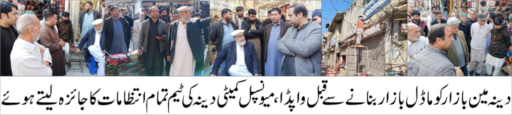 دینہ (رضوان سیٹھی سے) دینہ مین بازار کو ماڈرن بازار بنانے کے سلسلے میں کام کرنے سے قبل تمام انتظامات کا جائزہ لینے واپڈا اور میونسپل کمیٹی ٹیم کا بازار کا دورہ، جس پر باقاعدہ آئندہ چند روز میں کام کا آغاز کر دیا جائے گا۔ تفصیلات کے مطابق وزیر اعلیٰ پنجاب مریم نوا ز شریف کے ویژن کے مطابق بازاروں کو ماڈل بازار بنانے کے لیے کام کا آغاز کیا جا رہا ہے جبکہ دینہ میں بھی مین بازار کو ماڈرن بازار بنانے کے سلسلے میں ایس ڈی او واپڈا دینہ لائن سپرینٹینڈنٹ ٹھیکیدار آئیکسو اور میونسپل کمیٹی دینہ کے انجینئر حافظ عامر نے بازار کا دورہ کیااور کام شروع کرنے سے قبل تمام معاملات کا جائزہ لیا جس پر آئندہ چند روز تک کام کا آغاز کر دیا جائے گا جس میں مین بازار دینہ کو خوبصورت بازار بنانے کے لیے دوکانوں کے آگے خوبصورت یکسان شیڈ بجلی اور پی ٹی سی ایل کی تاروں کو زیر زمین منتقل کیا جائے گا تاکہ بازار کا حسن بحال ہو سکے اور حادثات سے بھی بچاؤ کا عمل ہو سکے اور خوبصورتی کے اضافہ کے لیے ٹف ٹائل بھی لگائی جائے گی تاکہ پیدل چلنے والوں میں آسانی ہو سکے سمیت دیگر کاموں پر آغاز کیا جائے گا۔